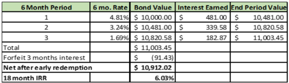 Hypothetically, had you invested in August 2022 and redeemed your I Bond today, you would walk away with an annualized investment return of 6.03%, not too shabby for a low-risk investment. Those investable dollars could now be repositioned in a new I Bond carrying a higher base rate, or in another investment vehicle of your choice.
